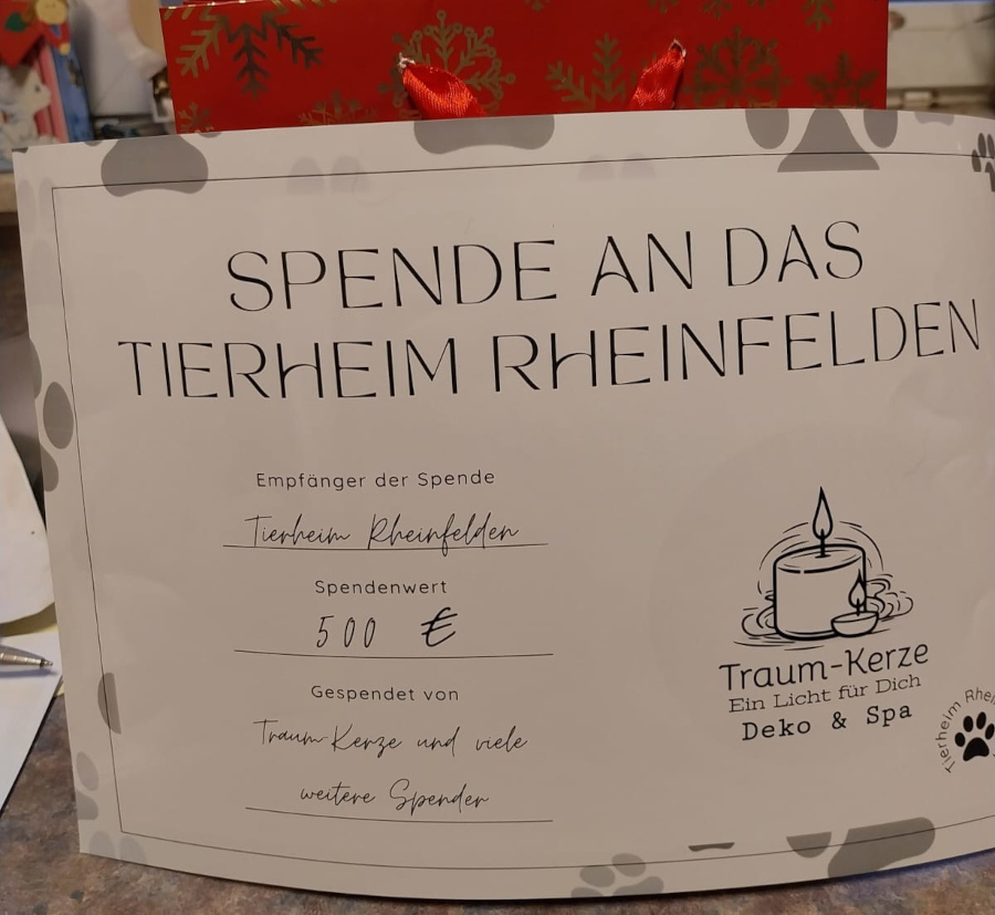 Das Tierheim Rheinfelden bedankt sich herzlich für die 500 Euro Spende des Geschäfts Traum-Kerze Deko & Spa.